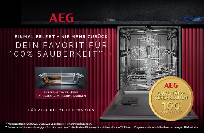 Im Rahmen der Aktion „AEG Qualitätsversprechen“, die ab sofort bis zum 31. Dezember 2026 läuft, können Käuferinnen und Käufer eines Geschirrspüler-Modells der neuen AEG Favorit Serien 8000 und 9000 in Deutschland und Österreich ab dem Rechnungsdatum 100 Tage testen. Das erworbene Gerät muss dazu auf der Aktionsseite www.aeg-versprechen.de bzw. www.aeg-versprechen.at registriert werden. Sollte der Geschirrspüler innerhalb dieser Zeit nicht vollständig überzeugen, kann das Gerät online zurückgegeben werden. AEG übernimmt die komplette Abwicklung – von der Abholung bis zur Rückerstattung – und entlastet damit den Fachhandel.