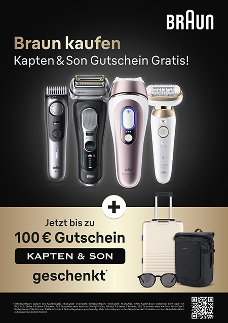 So funktioniert die Teilnahme: Die Kundinnen und Kunden kaufen eines der Braun Aktionsmodelle, bewahren den Kaufbeleg auf und registrieren sich unter www.braun.de/promotions und folgen den Anweisungen für die Online-Verifizierung. Bei gültiger Teilnahme wird der entsprechende Gutscheincode zur direkten Einlösung im Onlineshop von Kapten & Son zugeschickt. Die Teilnahme ist nur mit einem Kaufbeleg aus dem Aktionszeitraum vom 15. Mai bis 31. Juli 2026 möglich. Einsendeschluss ist der 15. August 2026.