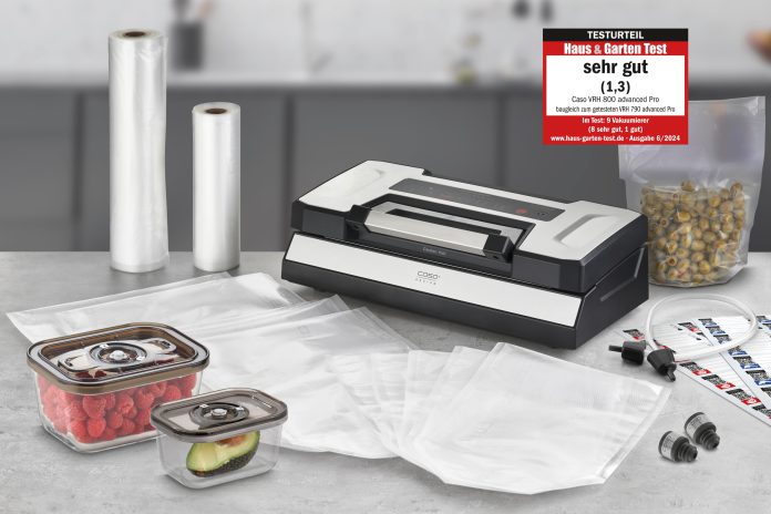 Mit dem VRH 800 advanced Pro von Caso Design ist das Vakuumieren schnell und einfach möglich, denn der hochwertige Vakuumierer bietet zahlreiche Funktionen für verschiedene Anwendungen. Auch Suppen oder Saucen können dank der patentierten Casotek Liquid Funktion vakuumiert werden. Der VRH 800 advanced Pro präsentiert sich mit zwei wiederverwendbaren VacuBoxxen für das Vakuumieren von besonders druckempfindlichen und flüssigen Lebensmitteln sowie zwei Aromaverschlüssen für die luftdichte Versieglung von bereits geöffneten Flaschen wie z. B. Wein oder Öl. Ein Schlauchanschluss, Schlauch und Adapter für das Vakuumieren von Behältern und Flaschen sowie Folienrolle und -beutel sind ebenfalls inklusive.
