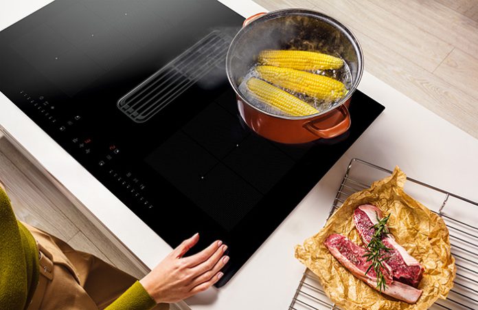 Das neue Modell DHKI 752 880 C kombiniert ein autarkes Induktionskochfeld mit einer leistungsstarken, aber dezenten Dunstabzugslösung. Das Gerät funktioniert sowohl im Abluft- als auch im Umluftmodus. Beim Abluft-Betrieb erfolgt durch einen beigefügten Adapter, der direkt an das Loch in der Außenwand hinter der Küchenzeile angeschlossen wird. Für den Umluftbetrieb benötigt man das optional erhältliche Zubehör „PSD100 Downair Set“ das die gereinigte Luft über die Sockelleiste ableitet.