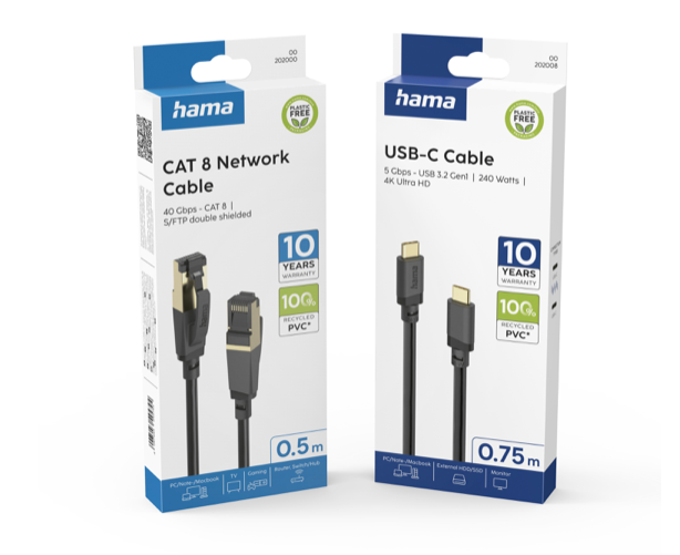 Der Zubehörspezialist Hama stellt sein Kabelsortiment auf ein neues Portfolio um, das zum Start 34 Artikel aus allen relevanten Produktbereichen umfasst und dem Fachhandel eine planungssichere Umstellung ermöglichen soll. Deshalb hat sich das Monheimer Unternehmen bei den UPE-Preispunkten am Niveau von 2019 orientiert. Bei den neuen Produkten hat Hama besonderen Wert auf Nachhaltigkeit gelegt: Alle Kabel werden in Deutschland plastikfrei verpackt und sind mit einem Kunststoffmantel aus 100 Prozent recyceltem Material ausgestattet, das herkömmliches PVC ersetzt.
