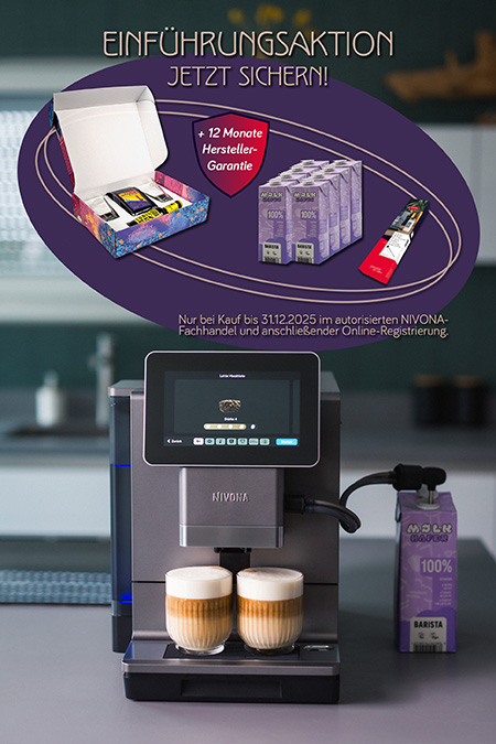 Zur Markteinführung der neuen 9000er Serie starten der Hersteller von Premium-Kaffeevollautomaten Nivona aus Nürnberg und Mølk, der Frankfurter Spezialist für hochwertige pflanzliche Milchalternativen, eine gemeinsame Sonderaktion. Käuferinnen und Käufer eines Kaffeevollautomaten aus der neuen 9000er Serie erhalten bis zum 31. Dezember 2025 nach Online-Registrierung ein exklusives Premium-Paket mit acht Litern Oat Mølk: Barista-Hafermilch und weiteren hochwertigen Extras im Gesamtwert von ca. 140 Euro.